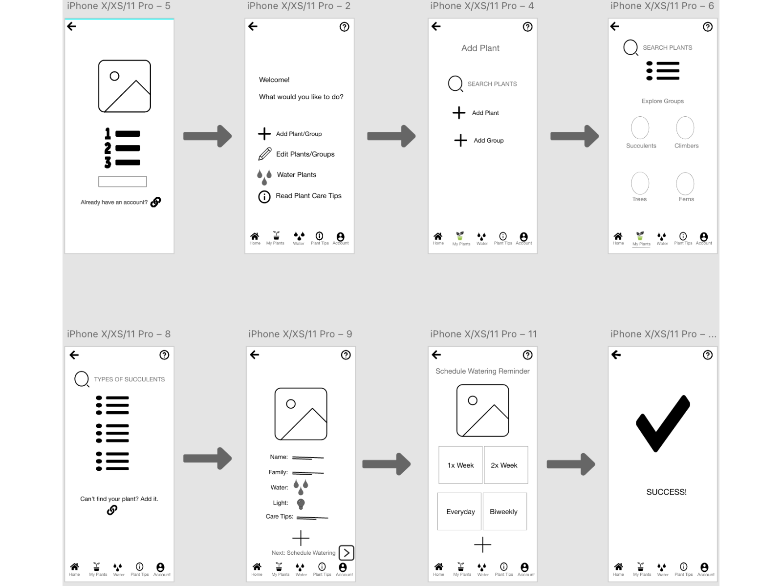 The following wireframes represent the tasks involved in adding a new plant. The first round of wireframes was subjected to usability testing, and then revised to see how they matched up with the actual needs of humans. The two subjects in the testing phase were encouraged to think out loud and ask questions as they demonstrated the manner in which they would participate in a series of tasks. I used Adobe XD to create these.